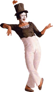Marcel Marceau1923, FranceThis mime is best known for his sad-faced clown character, Bip. Marceau has performed frequently with his company in the U.S. since 1955. "After the Second World War, emerged Marcel Marceau, who was a pupil of Decroux at the Dullin school. He created his own special character, known as 'Bip', who is a familiar sight, with his top hat with the flower sticking out, and his short jacket. Bip was a character similar to Pierrot, a down trodden character, who could sometimes win, but would always end up at the bottom of the ladder. Influenced by the silent film stars like Chaplin, and Keaton, Marceau was the architect of a totally new style and tradition, the true creator and master of modern mime as we understand it today." |