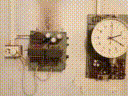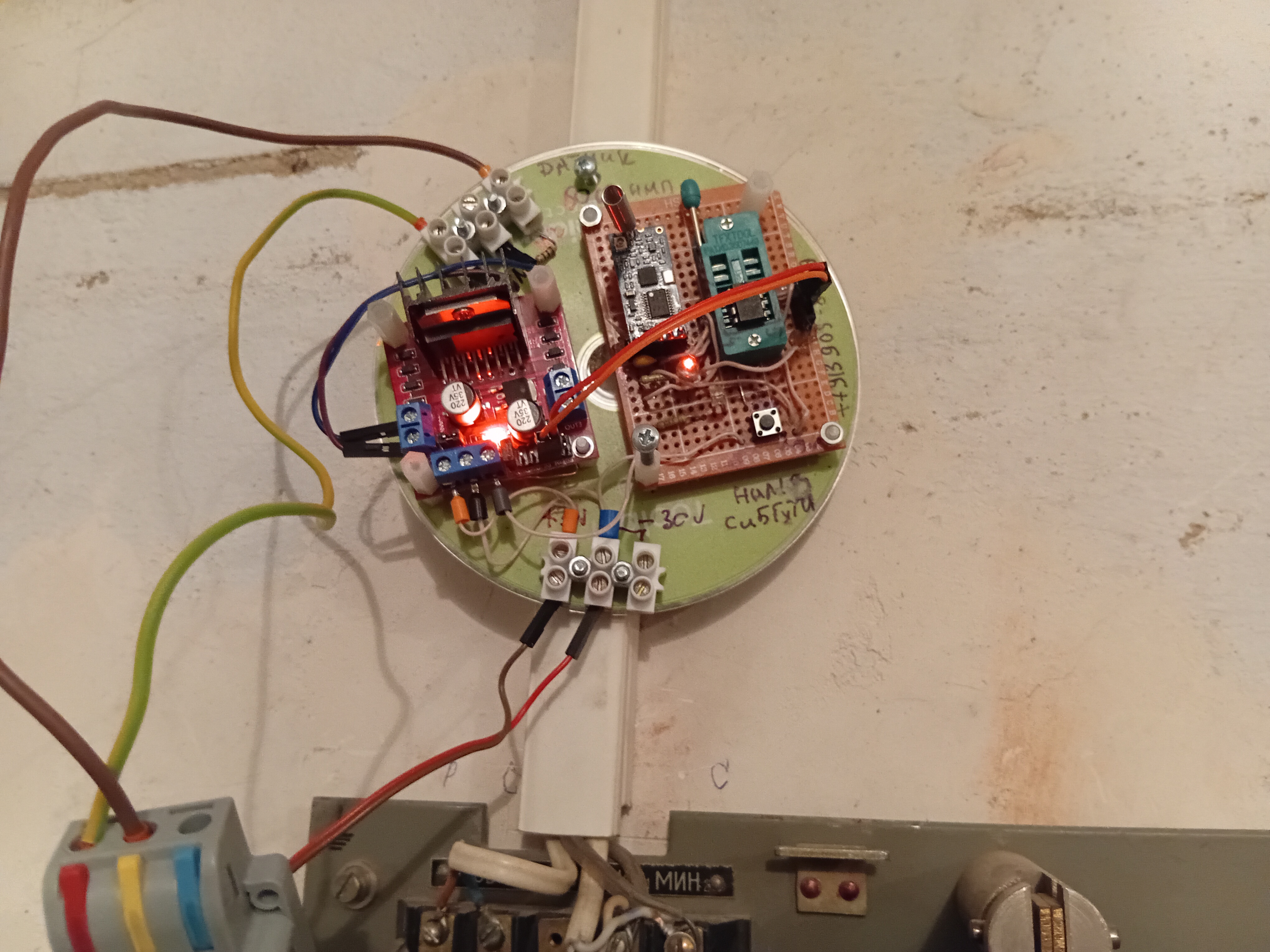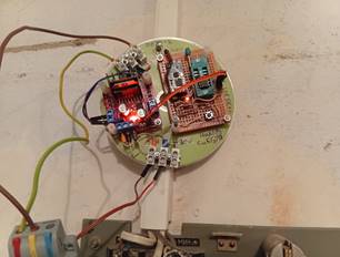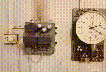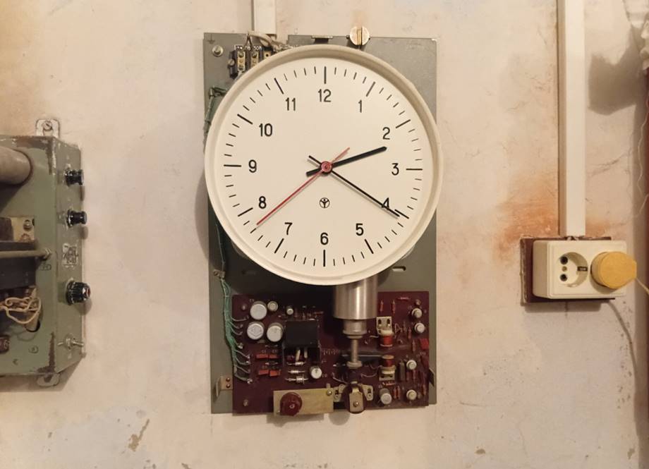 Размещена вся конструкция выше первичных часов на подводящем кабель канале, как показано ниже на фото и видео-фрагменте.