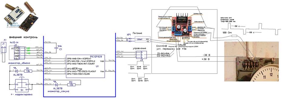 Работой модуля управляет по линиям GP0-D2 и GP1-D1 МК 12F629. Разные логические уровни формируют разное выходное напряжение и таким образом формируется импульс для вторичных часов. Формируется импульс длительностью от 100 до 200 мс, который и вызывает передвижение стрелки вторичных часов. Необходимо, что бы импульсы были последовательно «разнополярные». Такой режим предусматривается в счетчике на МК. В МК программно работает счетчик на период в 1 секунду и другой счетчик на 60 формирует импульсы для вторичных часов.