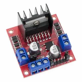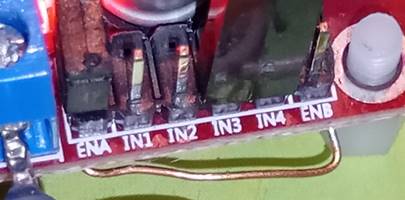 На модуле L298N на выходных разъемах припаяны перемычки: ENA+ENB IN1+IN4 IN2+IN3. На фото ниже виден фрагмент только ENA+ENB.