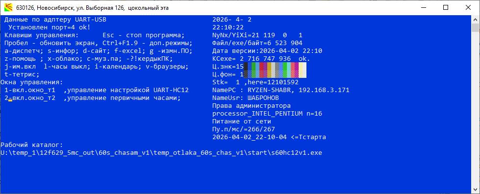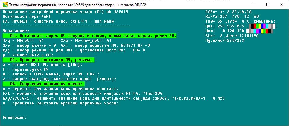 Запуск программы в каталоге с наличием файла инициализации выполняется по опциям данного файла. Это текстовый файл и он доступен для редактирования. Программа подготовлена для первичных часов на основании выше приведенной схемы. Первично начинает работать окно консоли и далее выбираются режимы работы.
