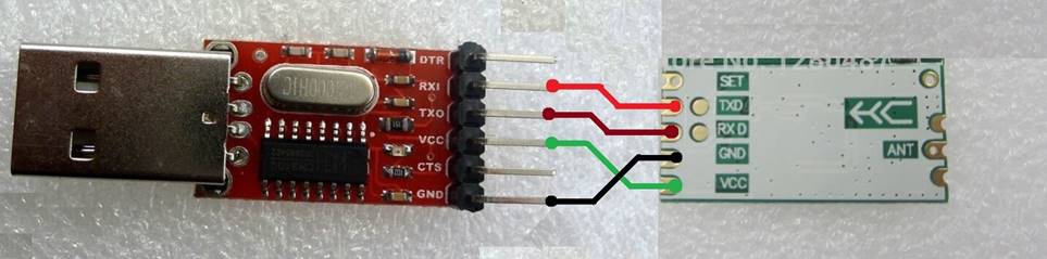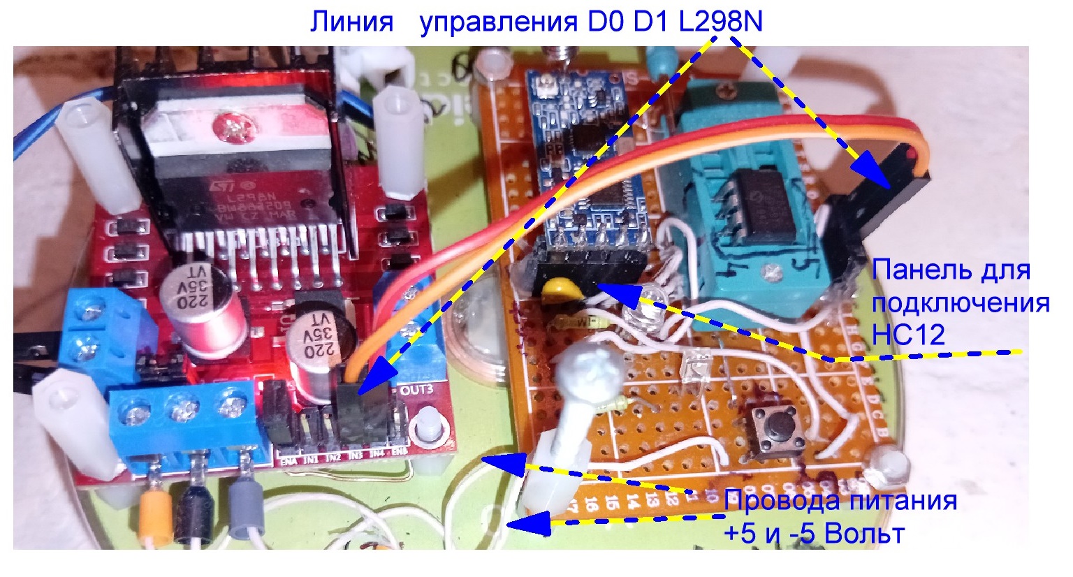 Модуль HC12 устанавливается на переходных штыревых разъемах, что позволяет быстро проверить, перепрограммировать или заменить данное изделие. Ниже на рисунке показаны в другом ракурсе модуль HC12 и линия управления D0 D1 для модуля L298N.